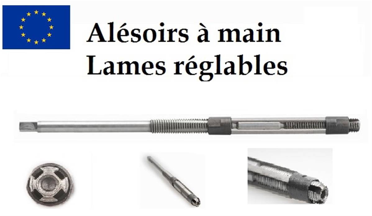Alésoirs à main Lames réglables renforcé HSS M2 Ø13,50-15,50 Chaque alésoir a une grande capacité de réglage. Celui-ci est obtenu précisément par l'intermédiaire d'une bague lisse ou d'un micromètre. Les lames ont une coupe conique. Les dentures sont détalonnées et rectifiées.