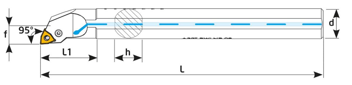 Barre d'alésage avec lubrification 95° PWLNR 06 - Plaquette WNMG 0604 - Dmin 25mm - d 20mm - L 200mm - L1 40mm - f 13mm - h 18mm