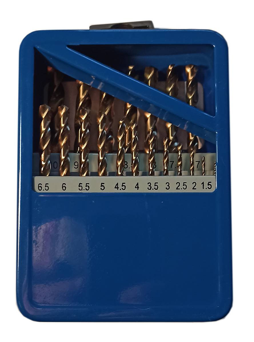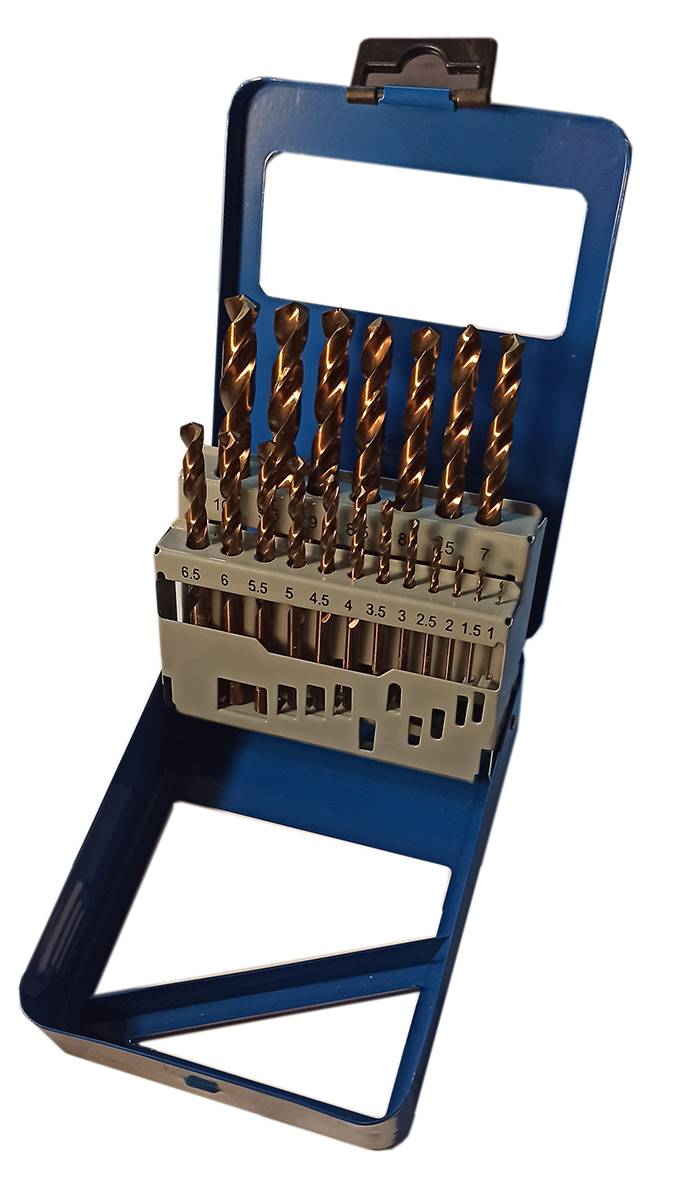 Coffret métallique de 19 forets cylindriques HSSE cobalt 8% M42 taillé meulé, Co8 de Ø 1 à Ø 10 par 0,5 mm. Affûtage en croix 135° - Auto-centreur - DIN 338 - Type N - Matière à usiner R = 1400 N/mm2 - Matière acier HSSE Co8 AISI M42 - Dureté (65-66 HRC) - Finition bronze taillé meulé