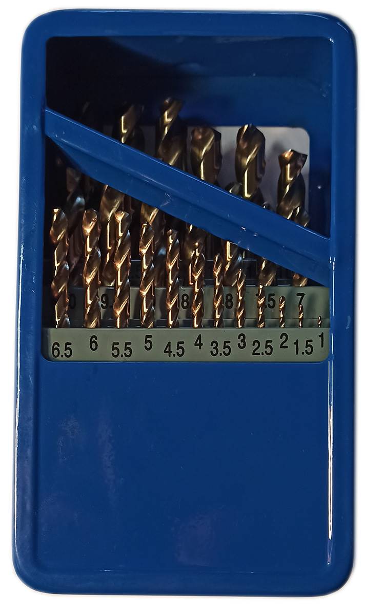 Coffret métallique de 25 forets cylindriques HSSE cobalt 8% M42 taillé meulé, Co8 de Ø 1 à Ø 13 par 0,5 mm. Affûtage en croix 135° - Auto-centreur - DIN 338 - Type N - Matière à usiner R = 1400 N/mm2 - Matière acier HSSE Co8 AISI M42 - Dureté (65-66 HRC) - Finition bronze taillé meulé