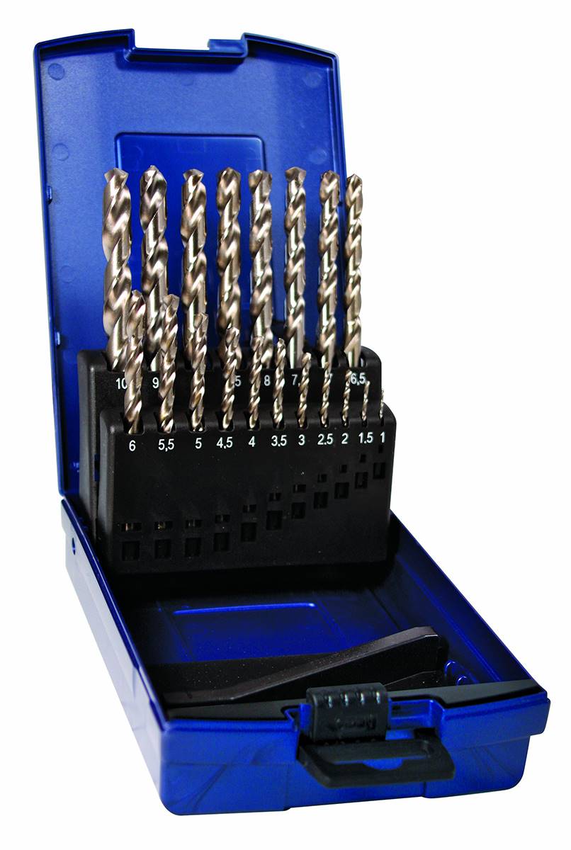 Coffret plastique de 19 forets cylindriques HSS taillé meulé et renforcé, TSX de Ø 1 à Ø 10 par 0,5 mm. Affûtage en croix 135°. Auto-centreur - DIN 338. Type N - Matière à usiner R = 800 N/mm2 - Matière acier HSS - Dureté (64-65 HRC) - Finition acier poli brillant renforcé taillé meulé