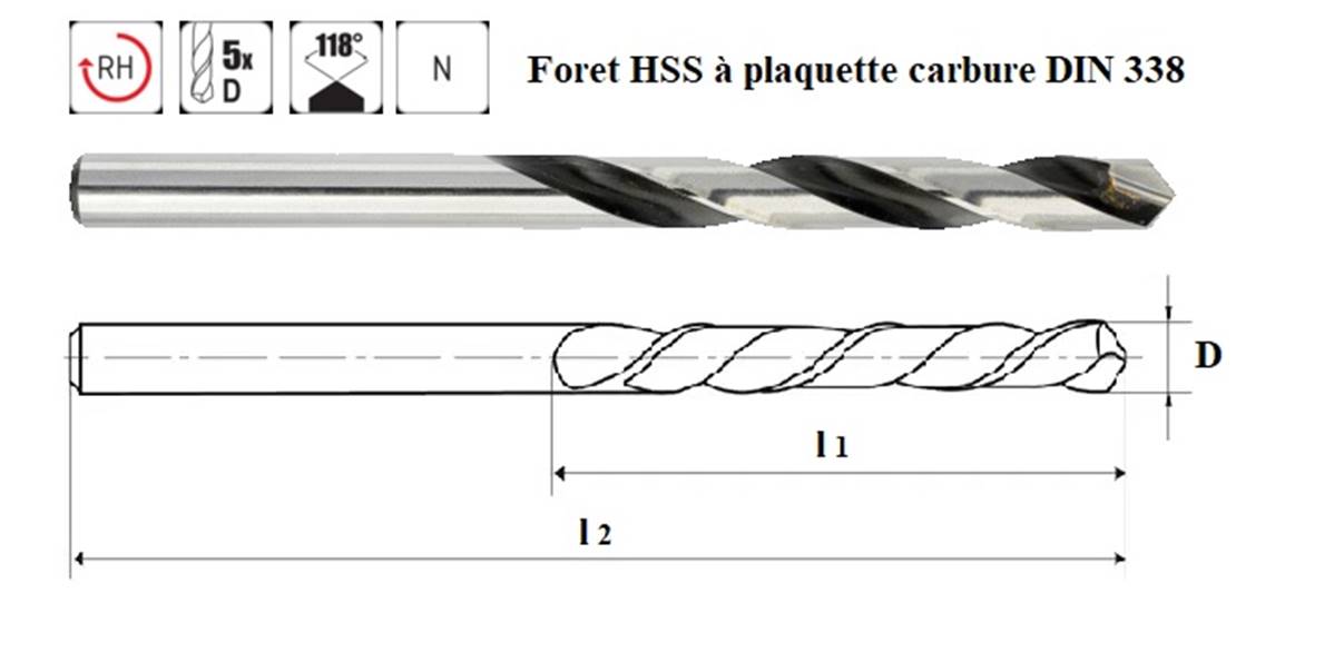 Foret carbure industrie à mise rapportée de tungstène K20 Din 338 Ø 2,75x61/33. Foret hélicoïdal à haut rendement HSS-G avec pointe carbure brasée, idéal pour des utilisations pour le perçage d'aciers résistants. Ce foret est conçu pour le perçage dans des aciers difficiles à usiner, permettant des vitesses de coupe élevées tout en offrant un bon centrage et une faible force d'avance.