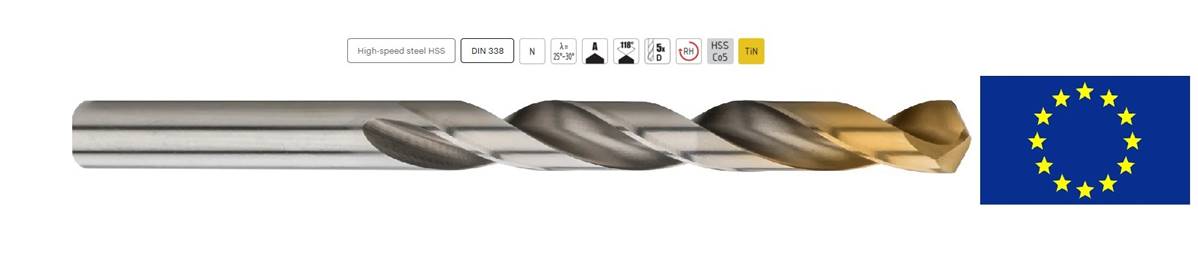 Foret taillé meulé blanc série courte hautes performances de fabrication Européennee Ø20x205/140 DIN 338 N, 118°HSS- M35 TIN, pour utilisation sur tour, centre d'usinage, perceuse à colonne, perceuse à main