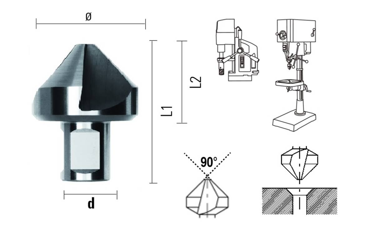 Fraise conique à ébavurer 90° 3 dents HSS - M2 weldon 19,05 mm Ø 50. Fraise à Chanfreiner HSS 3 Dents Taillée, Meulée et Rectifiée finition brillante. Attachement Weldon 19,05 mm pour Perceuse à Embase Magnétique. Idéale pour noyer les têtes de vis dans les aciers et les inox en atelier ou sur chantier Attachement queue Weldon particulièrement adaptée pour l'attachement des outils sur perceuses à embase magnétique. Acier rapide HSS-M2 pour les usages généraux dans l'acier jusqu'à 950 N/mm², les fontes et les aluminiums. Tête 3 taillants permet une excellente répartition des efforts de coupe et un état de surface soigné. Angle de fraisage 90°pour la réalisation de chanfreins à 90° afin de noyer les têtes de vis et/ou de rivets.