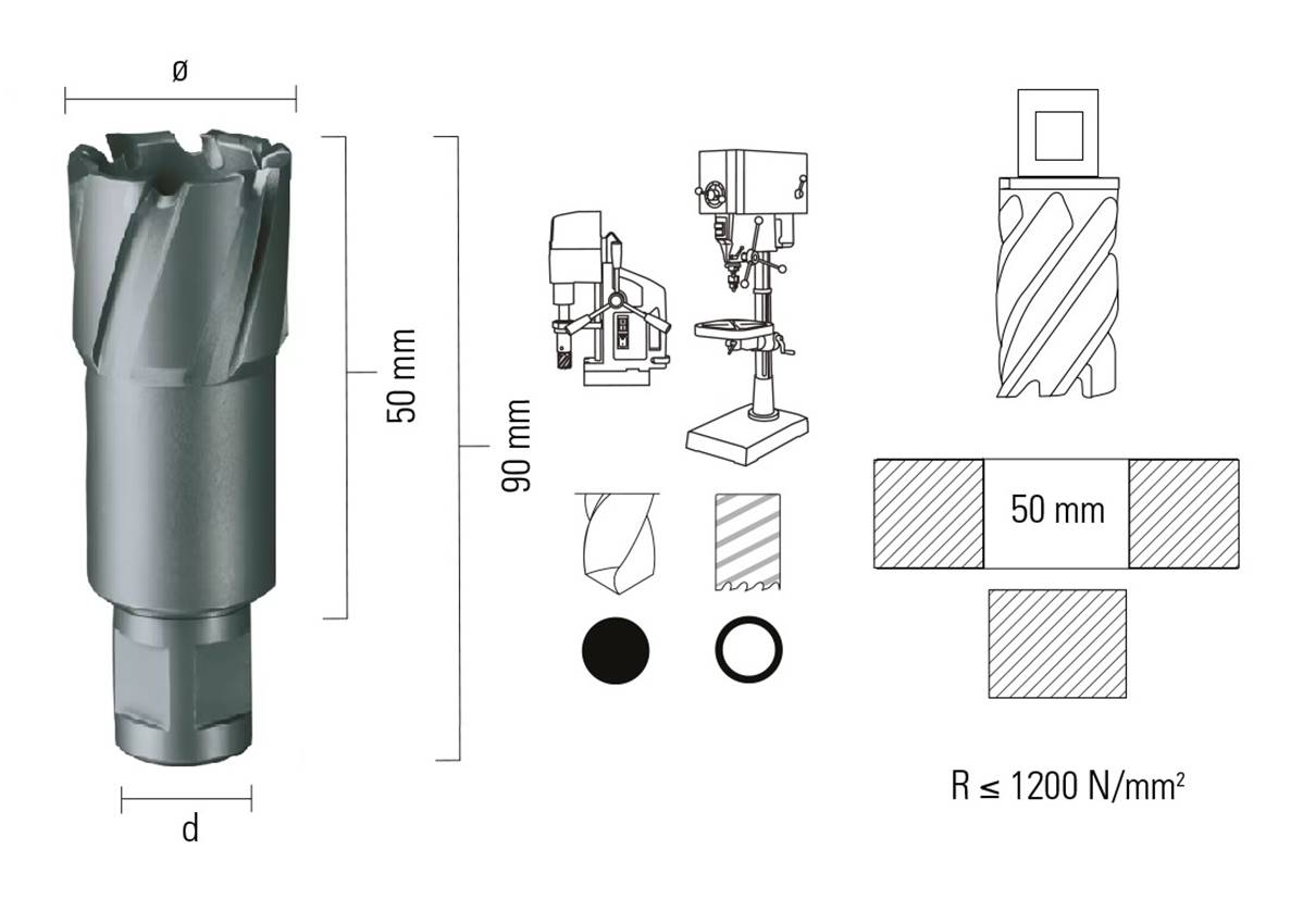 Fraises à carotter Carbure Weldon 19,05 mm Ø 26X90X50 mm La nuance carbure utilisée offre une durabilité encore accrue par rapport à l'acier rapide et permet l'attaque des matériaux les plus difficiles à usiner. Queue Weldon 19.05 mm. Profondeur de perçage 30 mm . Réaffûtable. Idéale pour tous les travaux de Perçage/Carottage. Attachement queue Weldon