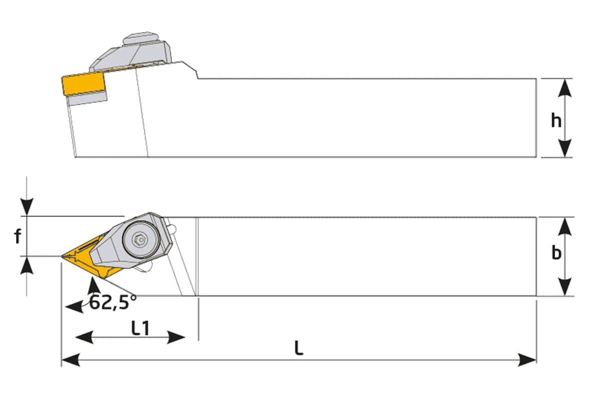 Porte outil de tournage extérieur 62,5° DDNNN - Plaquette DN 1506 - L 125mm - L1 40mm - h 20mm - f 10mm - b 20mm