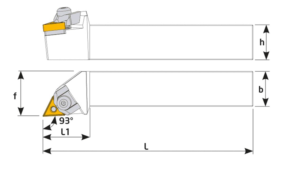 Porte outil de tournage exterieur 93° MTJNR - Plaquette TN 1604 L 150mm - L1 35mm - h 25mm - f 32mm - b 25mm - Vis de blocage TC046 M5 - Cale TA019 - Goupille de blocage BSP020 - Pince BK022 - Ressort BY043 - Rondelle BSP031 - Allen 3