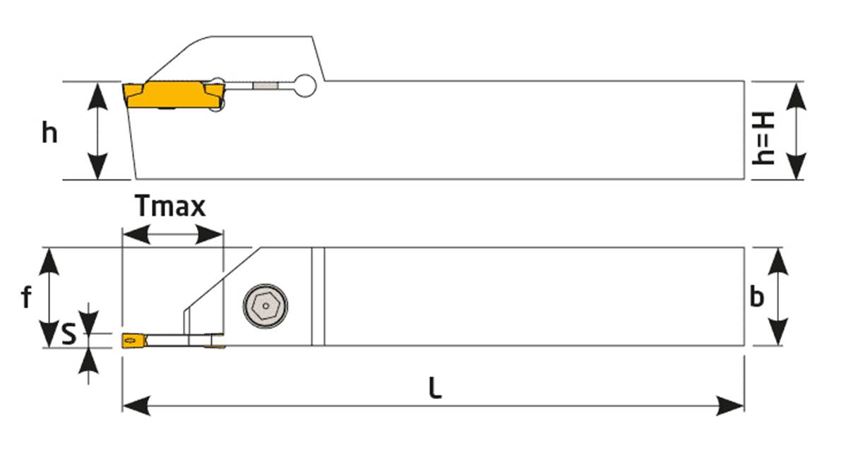 Porte outil de tronçonnage MGM/R - Plaquette 5CMGM KRLY - h=H 25mm - Tmax 25mm - b 25mm - S 5mm -f 25mm - L 150mm