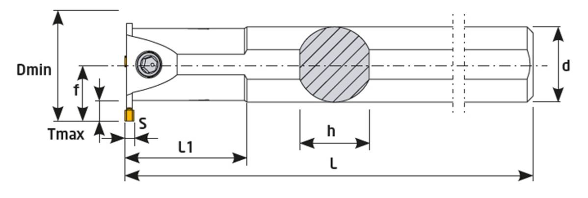 Porte outil de tronçonnage S20Q 2C-R S224 Grooving Holder Plaquettes S224 2C K.HRN - Dmin 26 - Tmax 6,5 - L 180 - L1 40 - d 20 - h 18 - f 16 - s 2