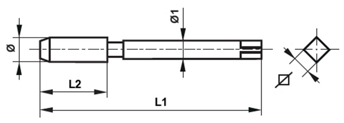 Taraud machine HSS-E(Co5%) filetage métrique ISO DIN 13 Forme C DIN 371 M 5mm x 0.80mm Tol. ISO2/6H L1: 70mm L2: 16mm Ø1: 6mm Carré: 4.9mm