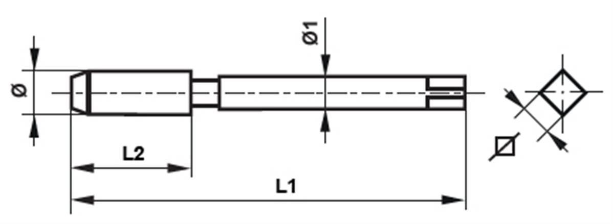 Taraud machine HSS-E(Co5%) filetage métrique ISO DIN 13 Forme C hélice 15° DIN 376 M 8mm x 1.25mm Tol. ISO2/6H L1: 90mm L2: 22mm Ø1: 6mm Carré: 4.9mm