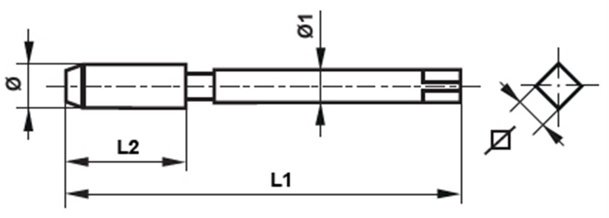 Taraud machine HSS-E(Co5%) filetage métrique pas fin ISO DIN 13 Coupe à gauche Forme C hélice 35° DIN 374 MF 5mm x 0.50mm Tol. ISO2/6H L1: 70mm L2: 5mm Ø1: 3.5mm Carré: 2.7mm