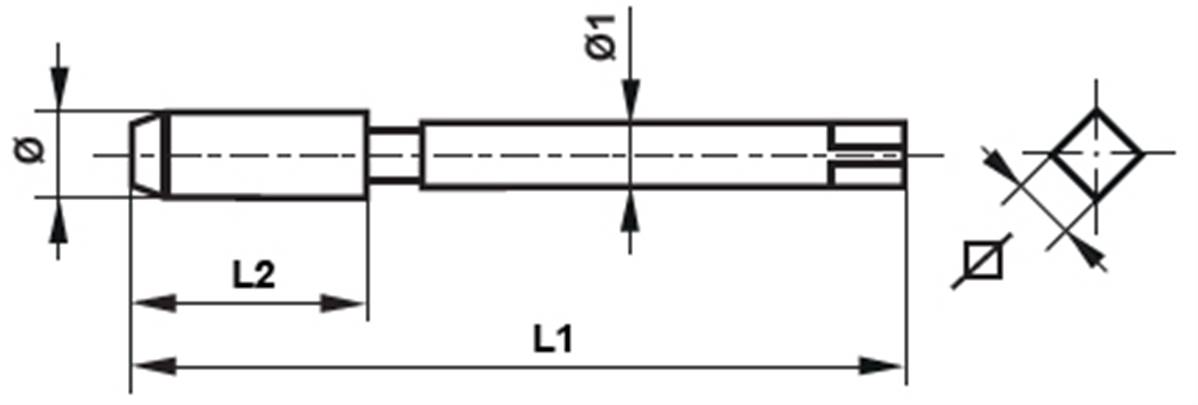 Taraud machine HSS-E(Co5%) minoré - 4H filetage métrique ISO DIN 13 Forme C hélice 35° DIN 371 M 8mm x 1.25mm Tol. ISO1/4H L1: 90mm L2: 14mm Ø1: 8mm Carré: 6.2mm