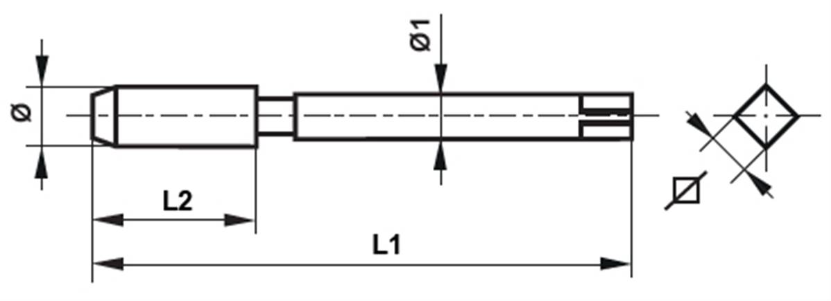 Taraud machine HSS-E(Co5%) filetage unifié ANSI 1.1 ISO 529 Forme B entrée GUN 12-UN 4" x 12filets/pouce Tol. 2B L1: 279mm L2: 89mm Ø1: 56mm Carré: 45mm