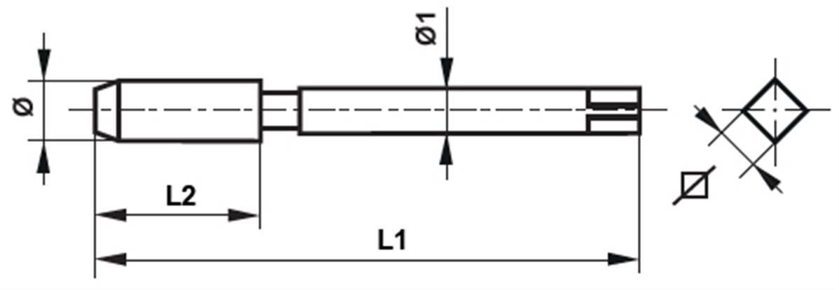 Taraud machine HSS-E(Co5%) filetage unifié ANSI B 1.1 ISO 529 Forme B entrée GUN UN 9/16 x 32filets/pouce Tol. 2B L1: 95mm L2: 30mm Ø1: 11.2mm Carré: 9mm