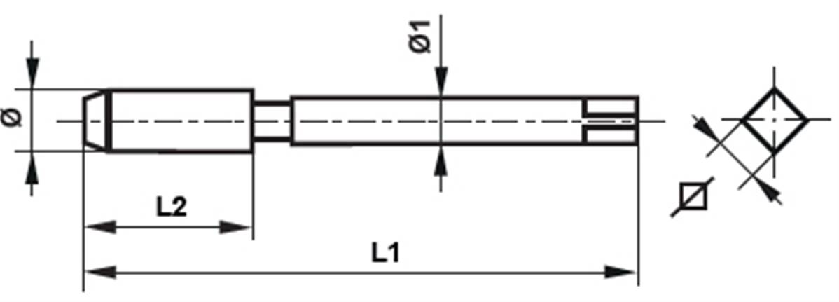 Taraud machine HSS-E(Co5%) filetage unifié pas fin ANSI B1.1 Forme B entrée GUN DIN 376 UNF 1" x 14filets/pouce Tol. 2B L1: 150mm L2: 28mm Ø1: 20mm Carré: 16mm