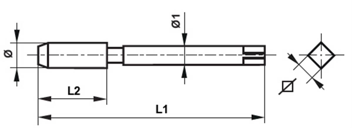 Taraud machine HSS-E(VAPO) Co5% filetage métrique ISO DIN 13 Forme B entrée GUN DIN371 M 3mm x 0.50mm Tol. ISO2/6H L1: 56mm L2: 11mm Ø1: 3.5mm Carré: 2.7mm