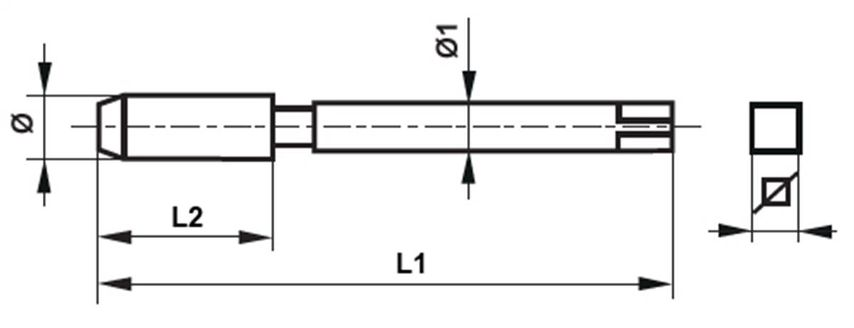 Taraud machine court HSS-E(Co5%) filetage gaz cylindrique Forme C hélice 35° NPS 1/8 x 27filets/pouce L1: 55mm L2: 19mm Ø1: 8mm Carré: H16mm