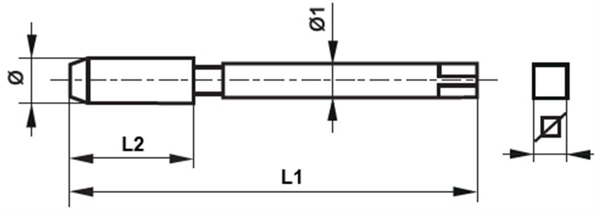 Taraud machine court HSS DIN 352 filetage conique Whitworth pour détendeur de bouteille de gaz, conicité 3:25, DIN 477 Forme C W 31,3mm x 14filets/pouce L1 110mm L2: 40mm Ø1: 22mm Carré: 18mm