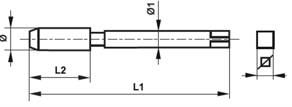 Taraud machine court HSS filetage gaz conique, conicité 1:16 Forme B entrée GUN Filetage intérieur conique BSPT 1.1/2 x 11filets L1: 110mm L2: 45mm Ø1: 38mm Carré 29mm