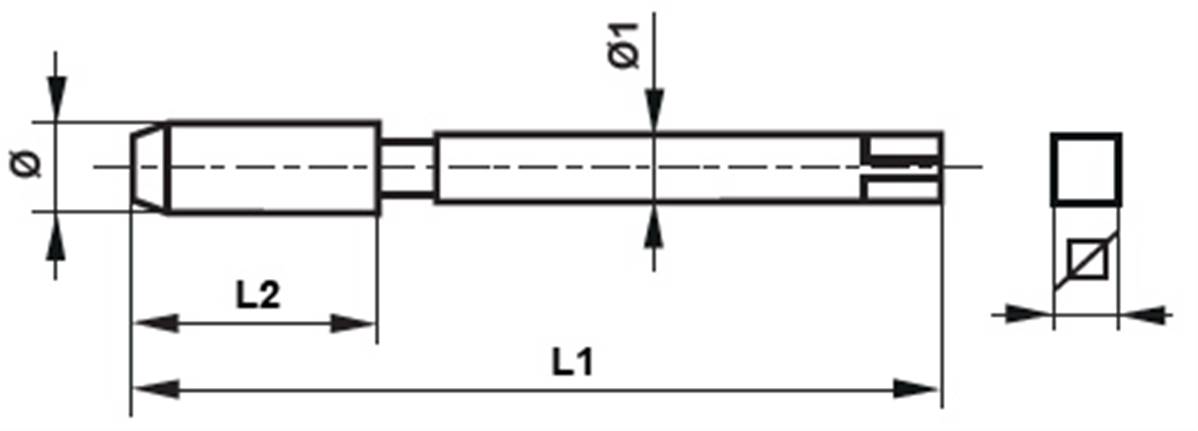 Taraud machine court HSS Forme C Hélice 35° Conicité 1:16 National petrol thread NPT 1/8 x 27filets L1: 55mm L2: 19mm Ø1: 8mm Carré: 6mm