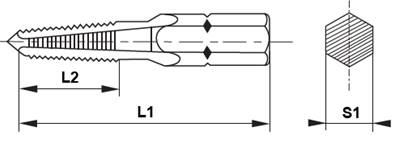 Taraud machine HSS avec queue hexagonale 1/4' filetage métrique pas fin ISO DIN 13 MF 5.5mm x 0.50mm Tol.ISO 2/6H L1: 35,0mm L2: 15mm S1: 1/4"